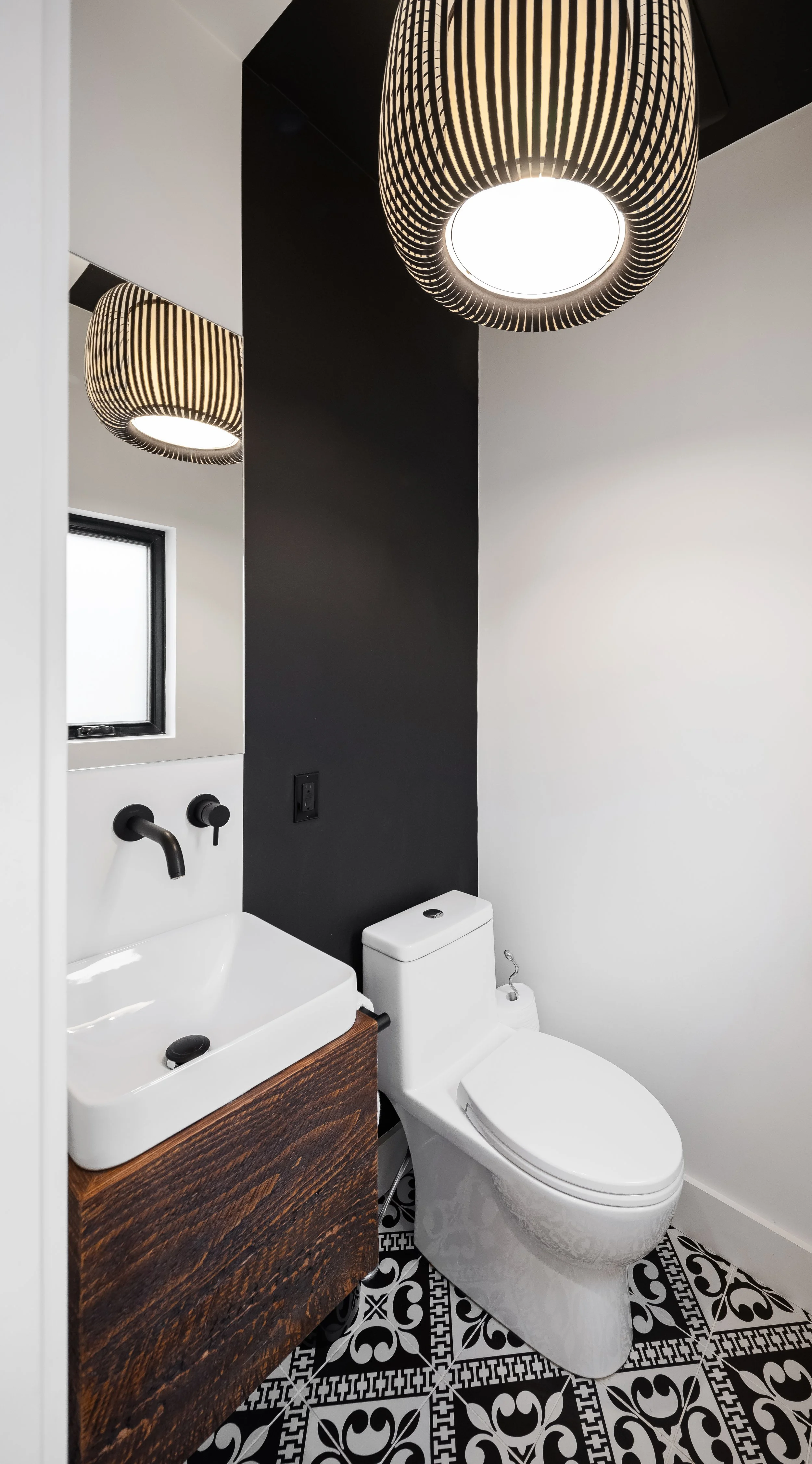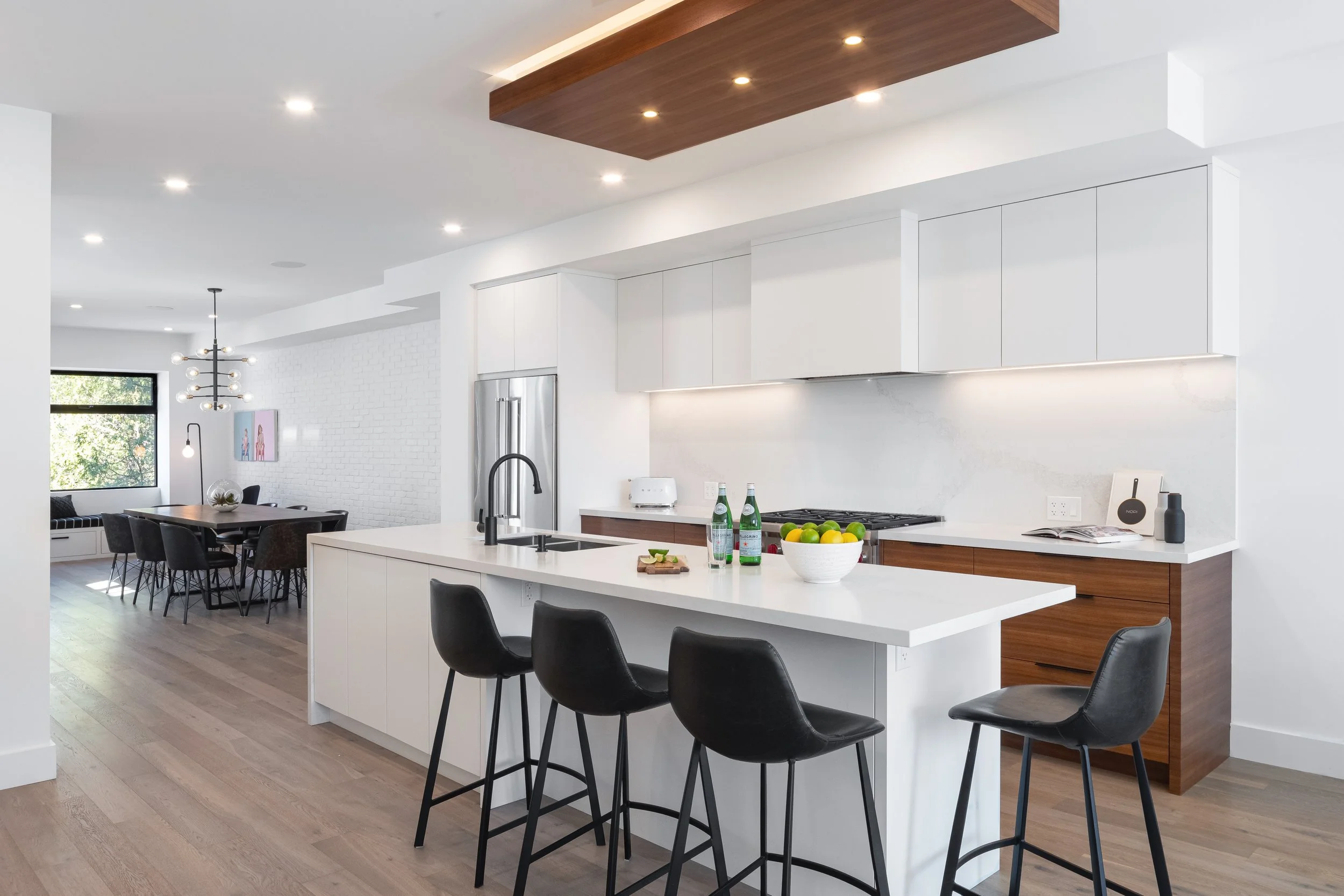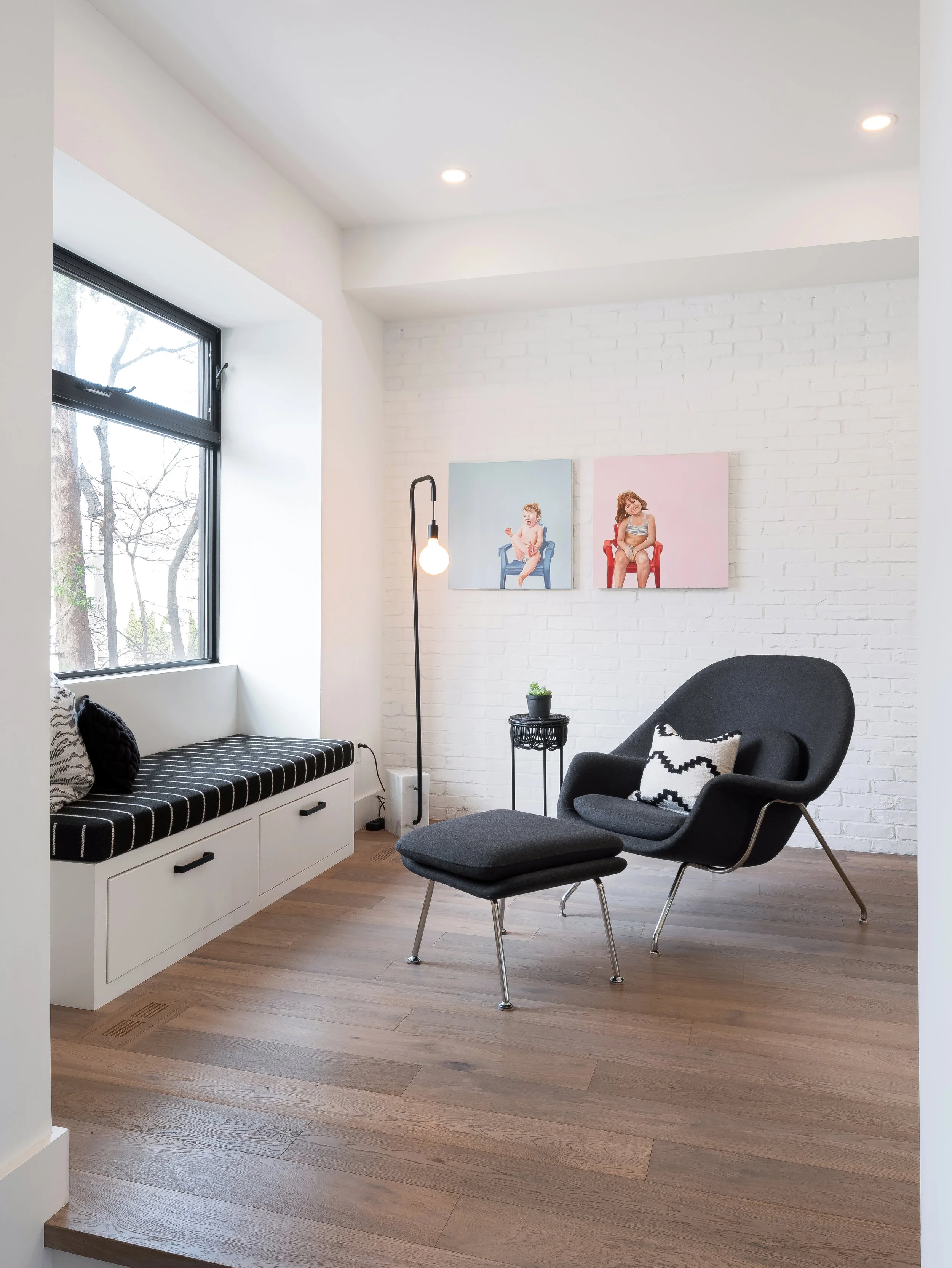 This family home in Leaside had been renovated in the 1990s and was in need of an update. Our clients wanted a more open, airy space to enjoy with their teenaged kids and guests. We did a full gut of the interior, and added a rear addition, as well. Unique elements, such as an elegant glass stair guard with steel handrail that extends from the basement up to the second floor, and a custom-made light fixture over the kitchen island were added, along with new windows and flooring throughout, and striking new bathrooms. The main floor was opened up into a large, completely open space, with a bright, modern kitchen right in the centre, perfect for entertaining.